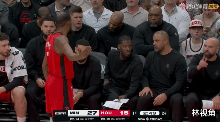 阿杜下场休息,申京回到场上带队,造杀伤罚球,第一罚罚丢,场边杜兰特摇头苦笑,身旁范弗里特等人也都乐了,申京第二罚命中。