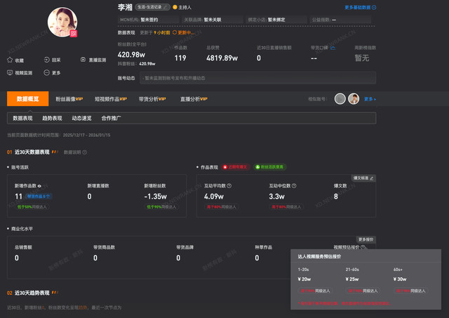 数据显示贝贝查,截至1月16日11时,李湘视频平台粉丝数为421万,近30日掉粉1.46万。商业化水平显示,其1-20s、21-60s、60s以上视频广告报价分别为20万元、25万元、30万元。